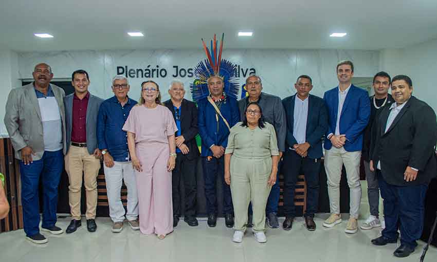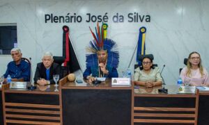No início da sessão, com a presença de lideranças indígenas (foto abaixo), no plenário, foi feita uma saudação para purificar o ambiente e dá força para enfrentar as dificuldades e harmonia entre os presentes.