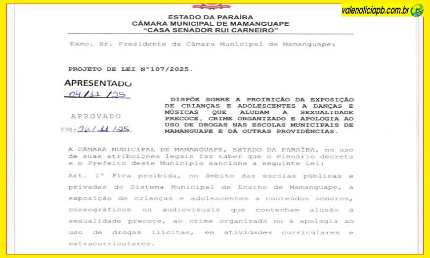 A PL de nº 107/2025, de autoria do vereador Guilherminho Fernandes, ‘dispõe sobre a proibição da exposição de crianças e adolescentes a danças e musicas que aludam a sexualidade precoce, crime organizado e apologia ao uso de drogas nas escolas municipais de Mamanguape (PB)’.