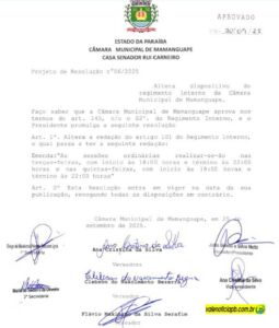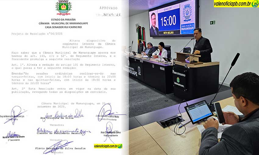 Já a sessão da terça-feira a noite permaneceu no mesmo horário, das 18h às 22h, conforme o Regimento Interno da Câmara de Mamanguape (PB).