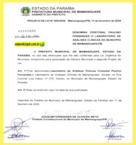 O legislativo de Mamanguape também aprovou o Projeto de Lei, nº 009/2026, de iniciativo do prefeito Joaquim Fernandes (PSB), que fica denominado de Cristobal Paulino Fernandes o Laboratório de Análises Clínicas, pertencente a prefeitura de Mamanguape, situado na Rua Coronel Luiz Inácio , nº 270, no centro da cidade.