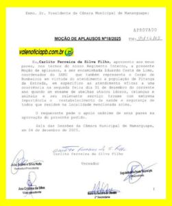 Moção de Aplausos, nº 18/2025, para Eduardo Costa de Lima, coordenador do SAMU de Mamanguape, pelos relevantes serviços, em virtude de uma urgência médica, momento em que um enxame de abelhas atacava idosos, crianças e animais, no Distrito de Pitanga da Estrada.