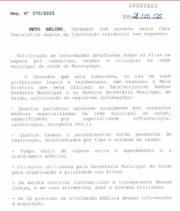 Requerimento de nº 570, abixo, de autoria do vereador João Belino e Silva Neto – Neto Belino (Republicanos), presidente da Câmara de Mamanguape (PB), solicita informações detalhadas sobre as filas de espera por consultas, exames e cirurgias na rede municipal de saúde de Mamanguape.