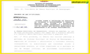 O referido Projeto de Lei, nº 83/2025, é de autoria do vereador Mooacyr Emilton de Figueiredo Cartaxo – Mooacyr Cartaxo (Solidariedade), do município de Mamanguape (PB), no Litoral Norte do Estado. A propositura, imagem abaixo, foi aprovada na 14ª Sessão Ordinária, realizada na noite de ontem, terça-feira (23/09). “Qualquer obra pública construída na cidade…