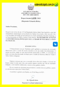 O requerimento n.º 1.579/2023, apresentado por Brito na Assembleia Legislativa da Paraíba, solicitava agilidade no processo de execução da ponte, destacando o estado deteriorado da estrutura atual e o impacto direto na mobilidade da população. O pedido foi encaminhado ao governador João Azevêdo, ao secretário de Infraestrutura, Deusdete Queiroga, e ao superintendente do DER, Carlos Pereira.