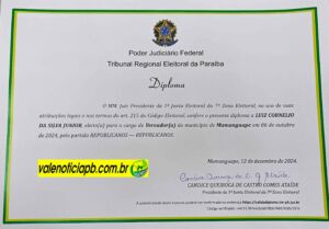 Diploma da Justiça Eleitoral emitido a “Júnior da Padaria”