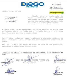 O destaque da pauta, imagem abaixo,  ficou para o Projeto de Lei, de nº 06/2026, que dispõe sobre implantação de mesas sinalizadas e adaptadas em ambientes de baixa estimulação para autista nos estabelecimentos comerciais do município de Mamanguape (PB).