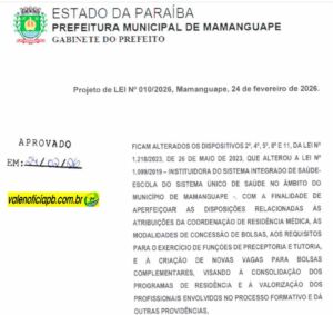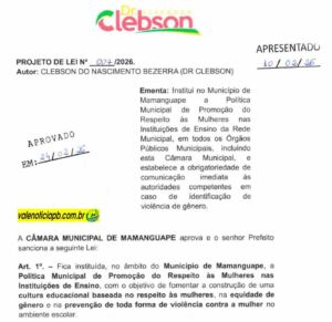 Já o Projeto de Lei, nº 007/2026, institui no município de Mamanguape (PB) a política municipal da promoção do respeito as mulheres.