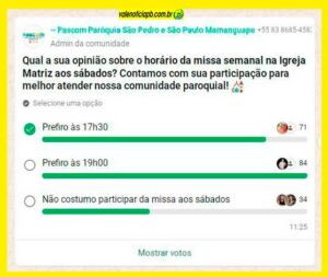 O padre Felipe Luz, administrador da Paróquia de São Pedro/São Paulo de Mamanguape (PB), no Litoral Norte do Estado, lançou no início deste final de semana, uma enquete, no Grupo do whatsapp da paróquia, com o objetivo dos fiéis escolherem o melhor horário da missa do sábado, na Igreja Matriz.