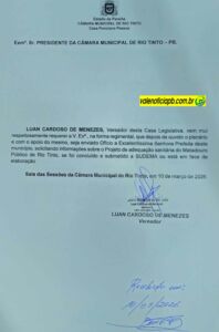 “Que seja enviado ofício a senhora prefeita solicitando informações sobre o projeto de adequação sanitária do Matadouro Público de Rio Tinto, se foi concluído e submetido a SUDEMA ou está em fase de elaboração?”.
