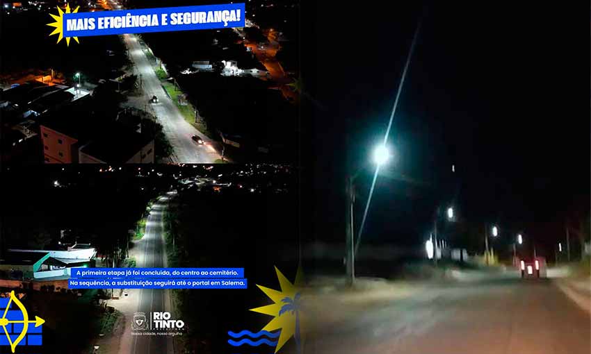 A Prefeitura de Rio Tinto (PB), no Litoral Norte do Estado, iniciou os serviços de modernização da iluminação pública na PB-041 com a substituição das lâmpadas de vapor de sódio por novas luminárias de LED. A gestão da prefeita Magna Gerbasi atende requerimento da vereadora “Valdirene do Sindicato”. Conforme informação da prefeitura a primeira etapa foi concluída, do centro da cidade ao cemitério. Na sequência, o trabalho seguirá até o portal em Salema, divida com o município de Mamanguape (PB).
